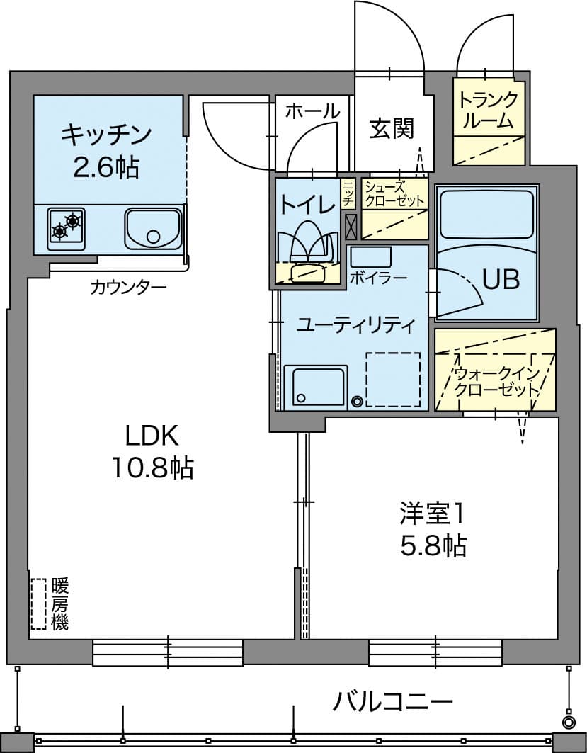 コンパクト1LDKでお部屋は10.8帖のリビングと5.8帖の洋室になっています。Cタイプの最大の特徴は収納が豊富なこと。シューズクローゼットも広く確保されているので靴や玄関小物はもちろんベビーカーも収納できるクローゼットです。また、洋室にもウォークインクローゼットがあるので安心。